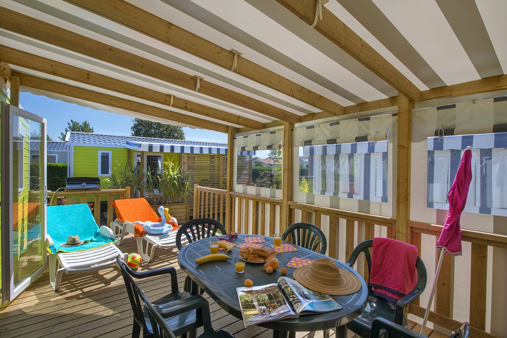 Terrasse bois semi-couverte avec salon de jardin et bains de soleil.